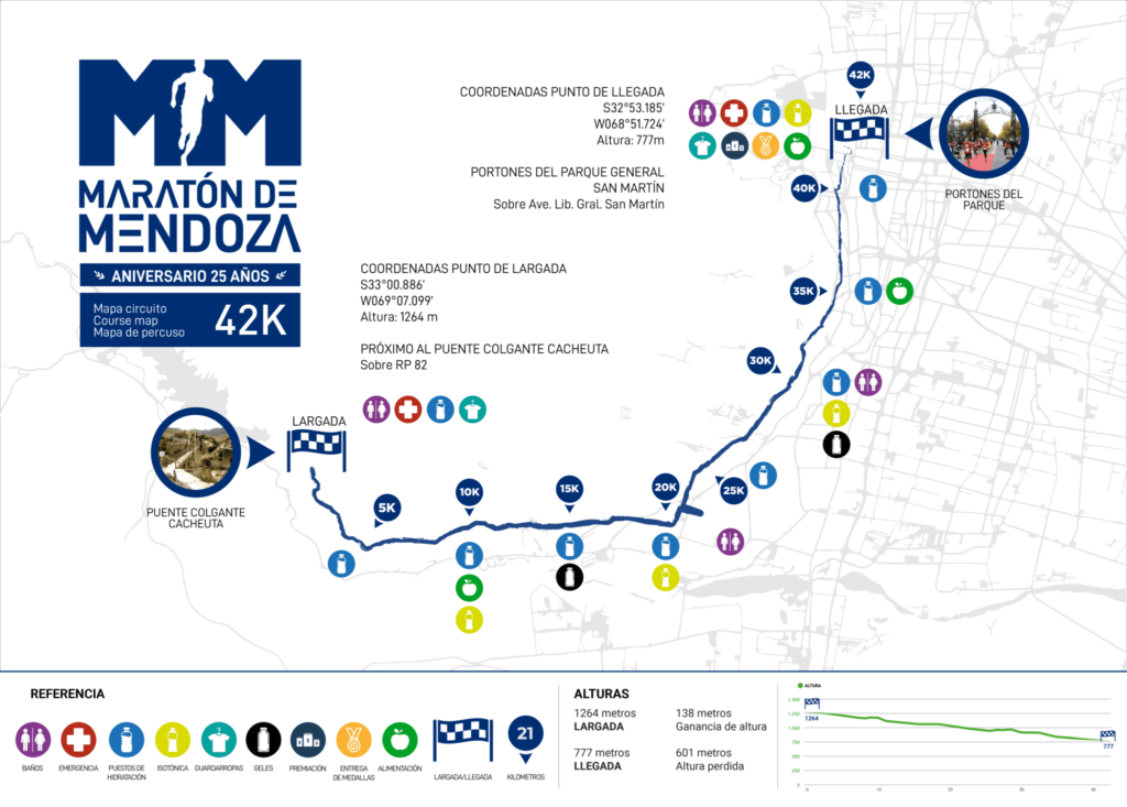 El evento se llevará a cabo el 4 de mayo de 2025 y contará con cuatro distancias para adaptarse a todos los niveles: 42K, 21K, 10K y 4K. La largada de la maratón completa será en el icónico Puente Colgante de Cacheuta, mientras que las demás distancias partirán desde distintos puntos estratégicos como Portal Vistalba, Palmares Valley y el Parque General San Martín. Todas las carreras finalizarán en los majestuosos portones del Parque General San Martín, en la ciudad de Mendoza.